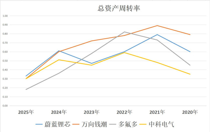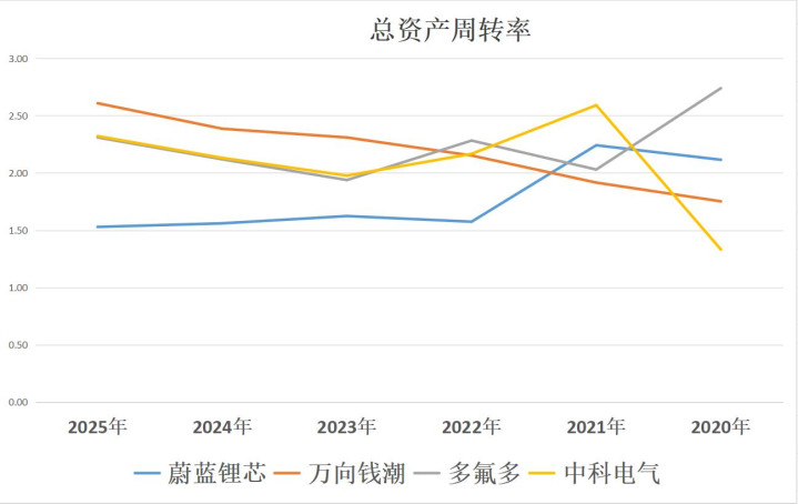 营运能力:蔚蓝锂芯>万向钱潮=中科电气>多氟多