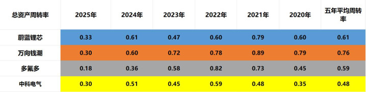 二季度,周转速度最快蔚蓝锂芯,总资产周转0.33次。其次万向钱潮和中科电气,再次多氟多。