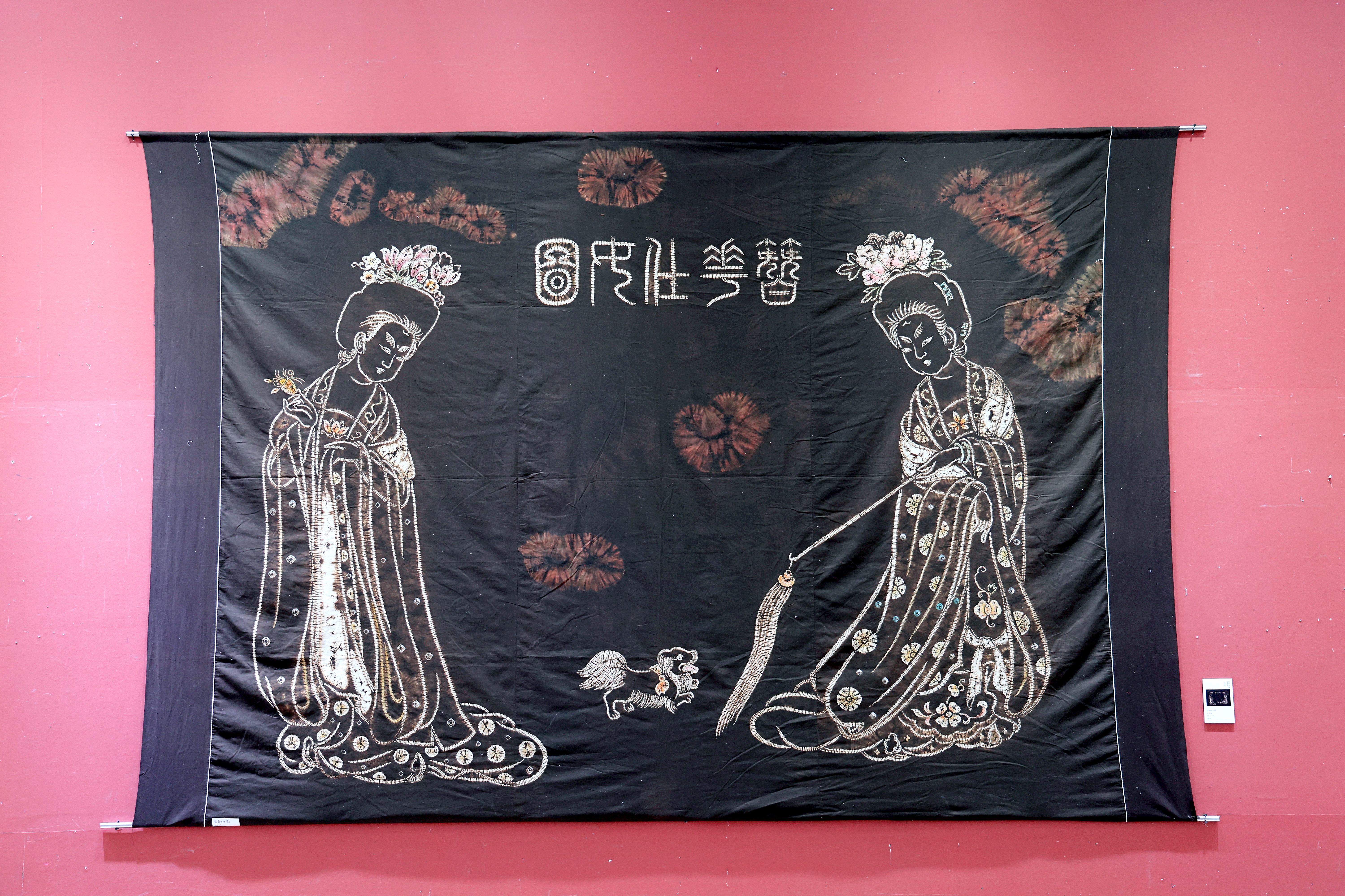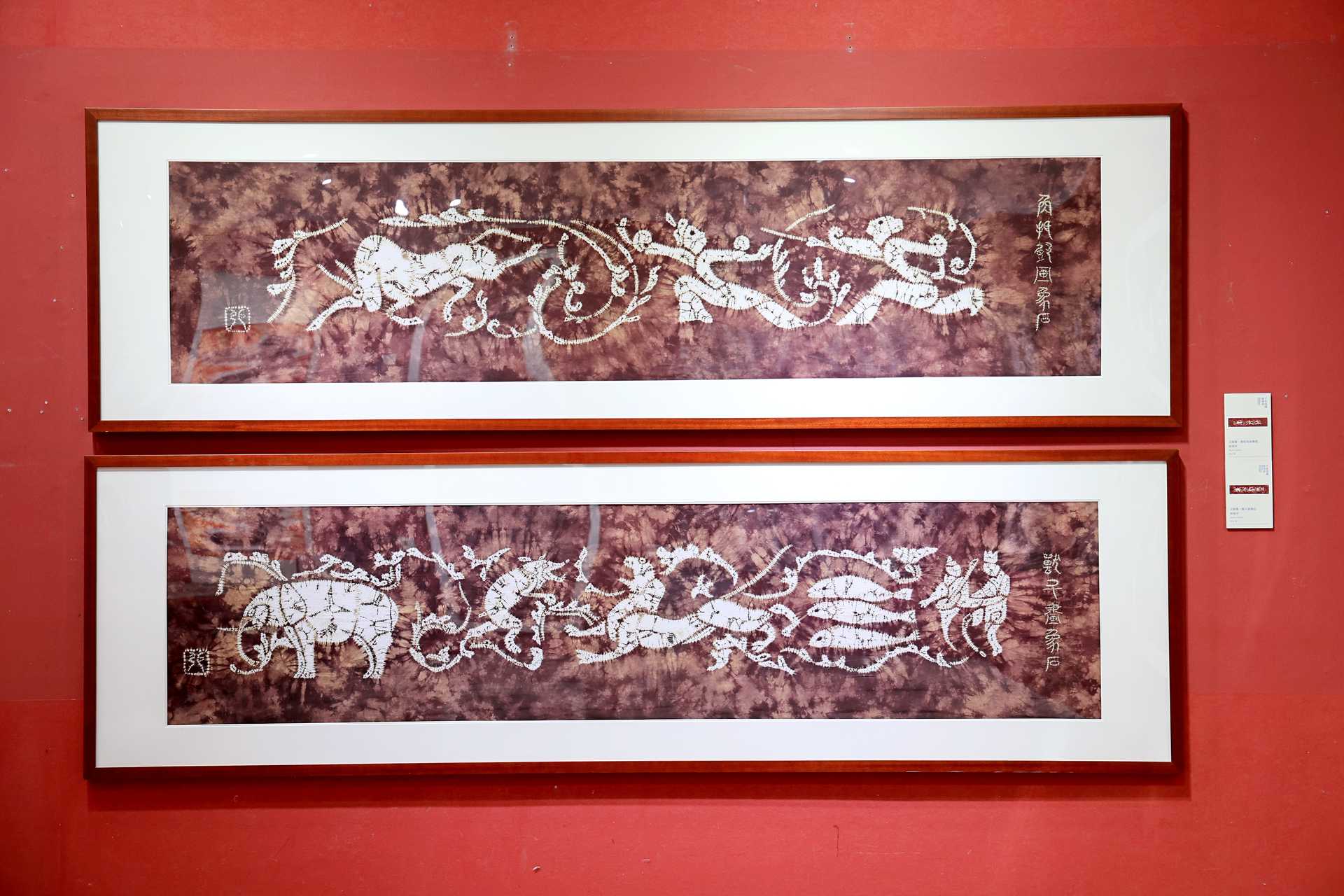 20世纪70年代末,张宇仲在继承四川传统“绞缬”艺术风格基础上,吸纳国画与现代艺术手法,不断突破创新,创作出了打破蜀缬传统纹样局限的《芙蓉鲤鱼》、还原了古代盐都先民开凿盐井之场景的《李冰开盐井图》等作品。为了更完整地展示自贡扎染技艺的艺术之美,本次展览特别展出了张宇仲的代表作,包括《簪花仕女图》《李冰开盐井图》等。作品中的人物神态栩栩如生,似由画笔勾勒,一展蜀缬的典雅古朴之美。
