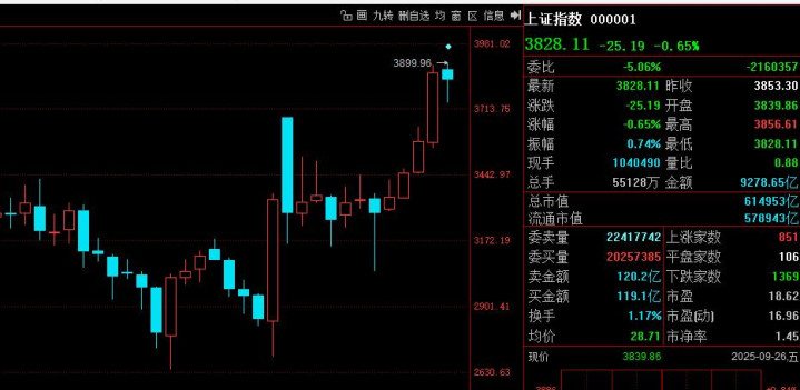 9月收官还有下周两个交易日,理想模式就是3827-3857-3872区间收官,当然万一破了3800点,也无需担心,因为调整极限位就在923的3774点(3772附近)。本月大盘开盘价是3869点,目前看月线收阳有难度,但事实上,大盘月线级别已经四连阳,9月如果收阴未必是坏事,因为常识告诉我们,牛市不代表月线会一直连阳模式,9月来根阴线后,反而有利于四季度月线三连涨。