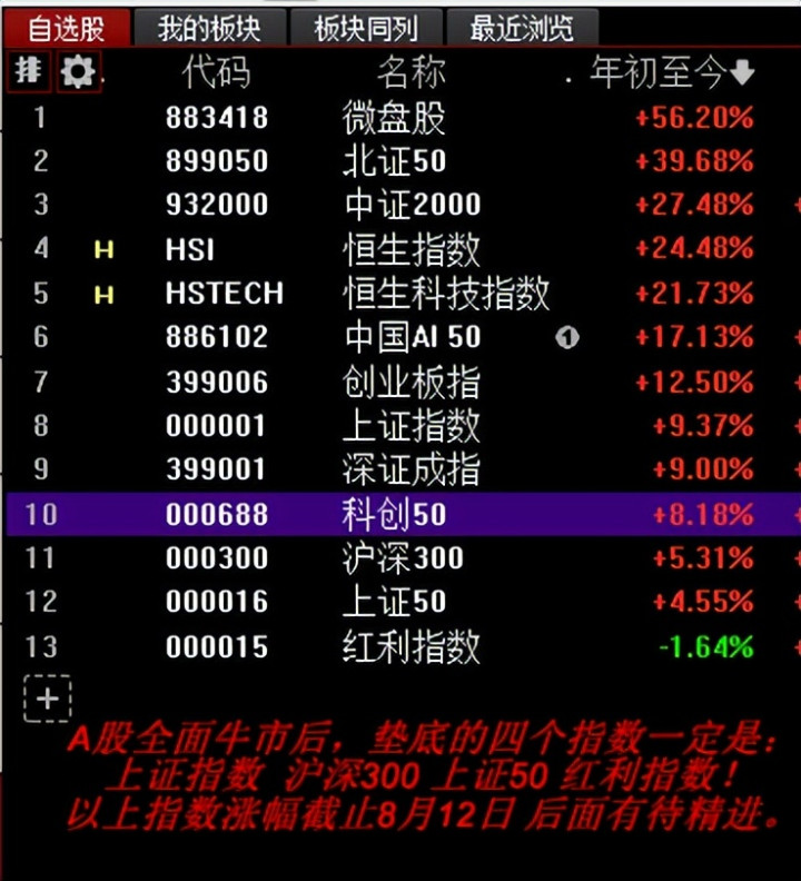 除了直接的指数高点来预判牛市外,还有就是指数涨幅结构,这个也是判断牛市级别及性质的关键,下图是8月12日指数涨幅榜情况。
