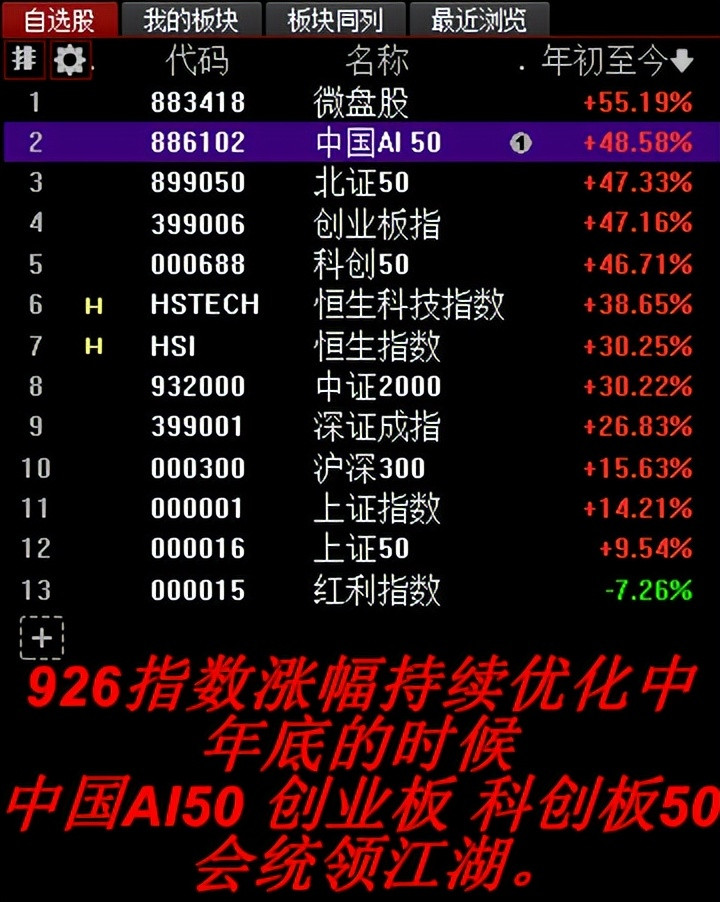 科技大时代,那么年底的时候领涨的必定是中国AI50 创业板和科创板50指数;而微盘股早已完成历史使命,所以后面会持续退位。中国AI50指数截止926年内涨幅是48%,基于科创不断强化,那么年内上调看80%预期涨幅,目标2600点,虽然本周中国AI50的2000点得而复失,但不影响四季度的继续精彩,中国AI50会是这波牛市中最靓的那颗星。